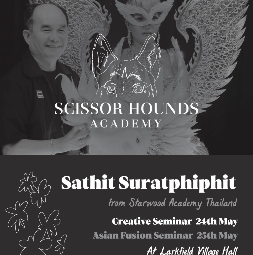 Exciting news for all dog groomers and pet styling enthusiasts in the UK! We are thrilled to announce that Scissor Hounds Dog Salon has partnered with Sathit, world renowned creative dog grooming expert from Starwood Academy Bangkok, for 2 dates which aim to bring his incredible skills and knowledge to the UK for one Creative & one Asian Fusion Dog Grooming Seminar!